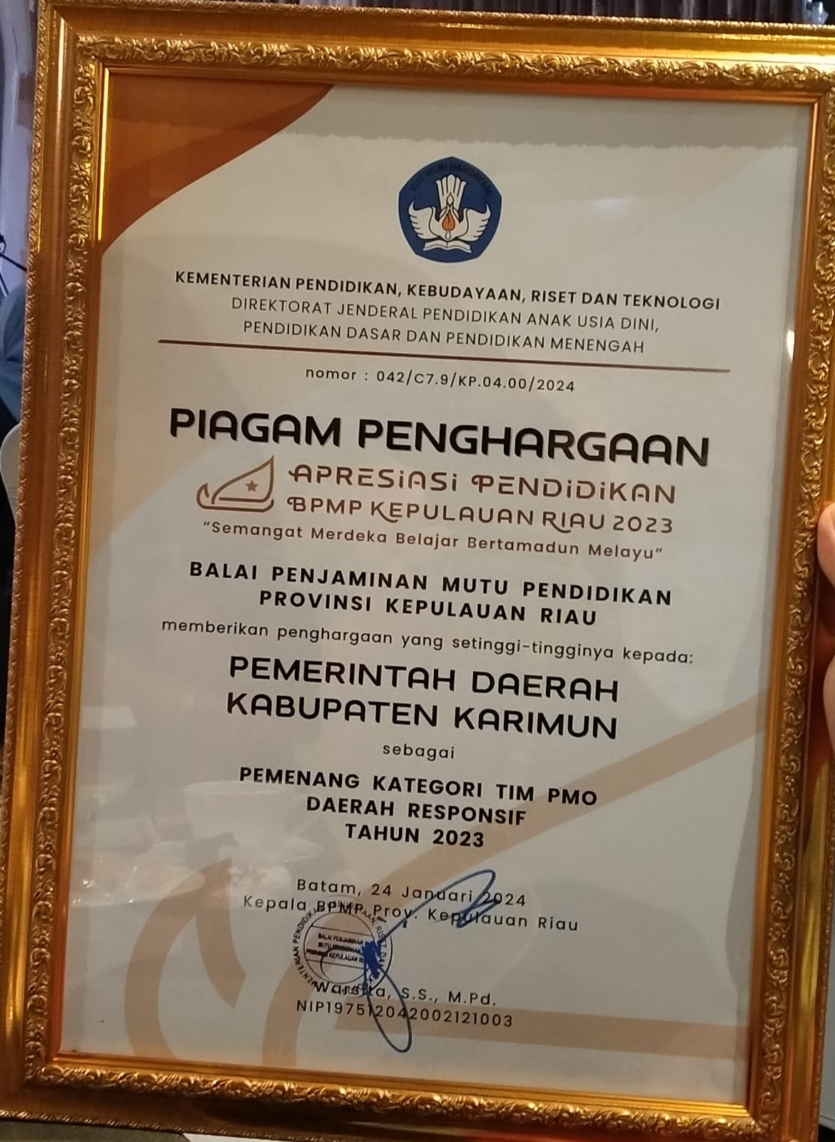 MALAM APRESIASI PENDIDIKAN 2023 BPMP PROVINSI KEPULAUAN RIAU January 25, 2024 admin “Semangat Merdeka Belajar Bertamadun Melayu” Pemenang kategori Tim PMO Daerah responsif Tahun 2023